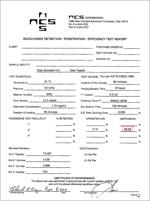 活性炭素繊維( WAC:Type-K 、TEDA添着、3層 )は米国試験規格( ASTM D-3803 )に準拠した捕集効率試験において、放射性ヨウ化メチル(CH3*I )捕集効率が99.999%以上という突出した性能を有していることが確認されました。