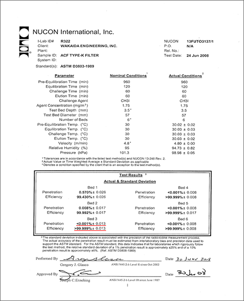 活性炭素繊維( WAC:Type-K 、TEDA添着、3層 )は米国試験規格( ASTM D-3803 )に準拠した捕集効率試験において、放射性ヨウ化メチル(CH3*I )捕集効率が99.999%以上という突出した性能を有していることが確認されました。